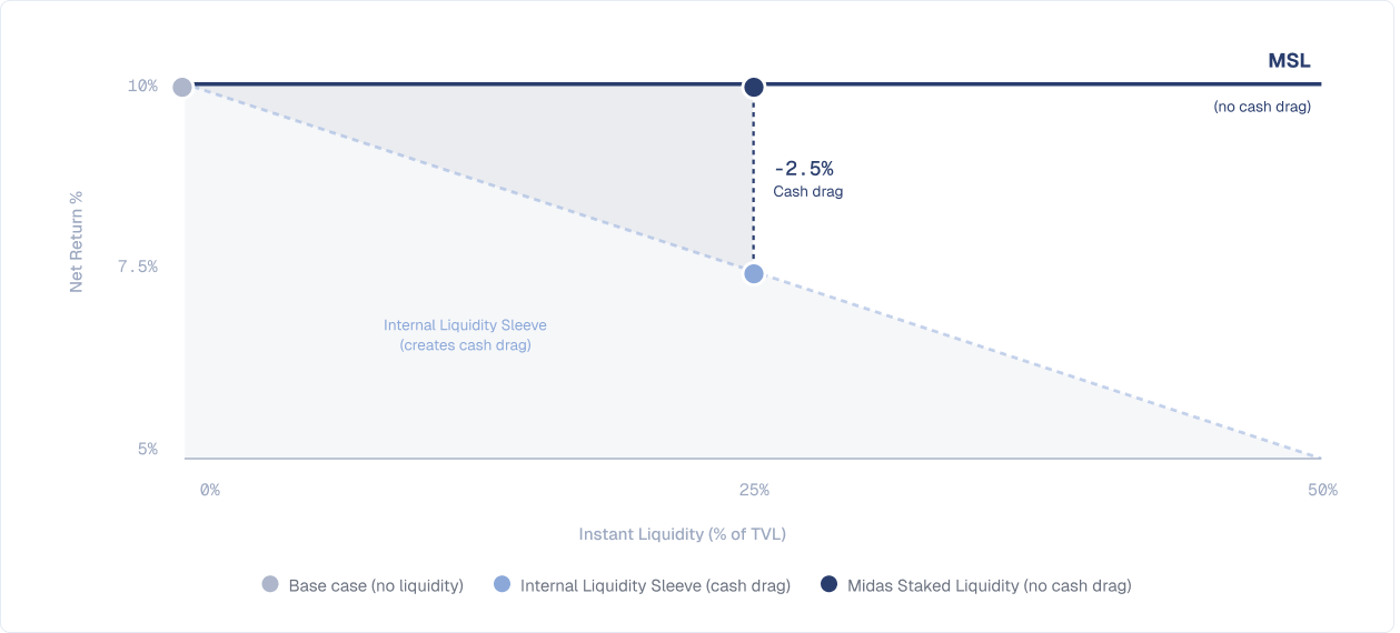 - Layer 2: Midas Staked Liquidity (MSL). As MSL is accounted external to the mTokens collateral, it provides instant USDC without diluting the underlying strategy's yield (i.e. no cash drag).