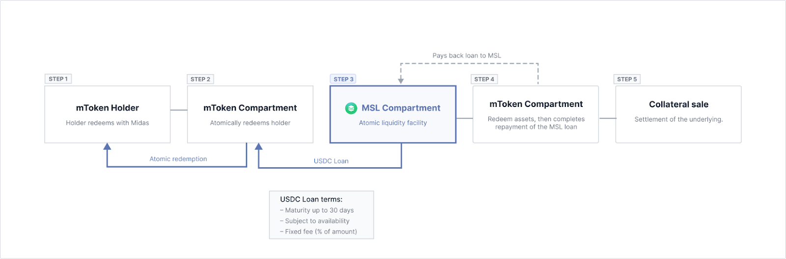 01. Loan and payout. MSL extends a USDC credit facility to the asset's compartment. The user is paid out immediately and their tokens are burned.